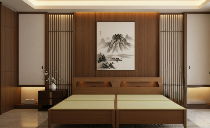 和の静けさと素材の格調が、寝室に豊かな余白と心地よい存在感をもたらします。